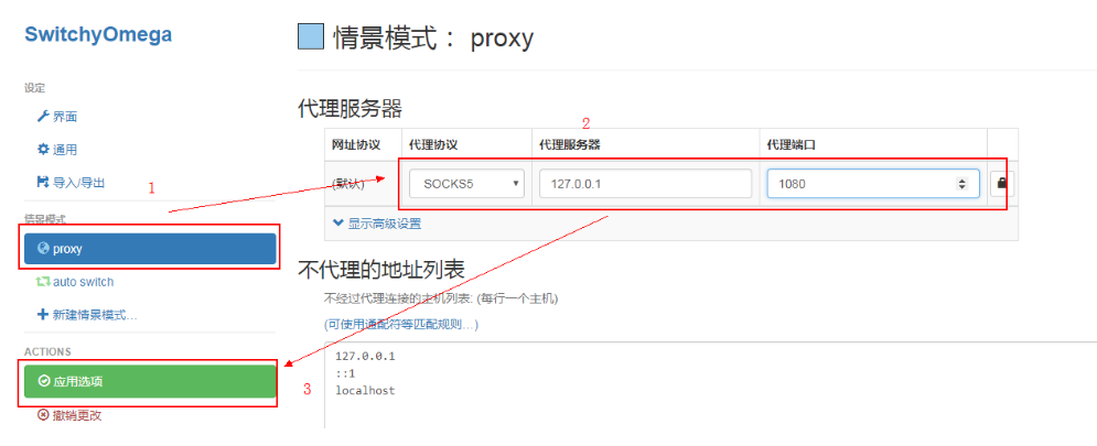 完成添加,会跳转到switchyomega页面,点跳过教程,然后点击proxy,如图填写,最后点击应用选项。