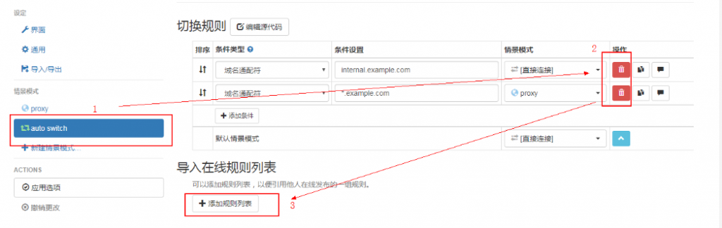 然后进入auto switch,删除最上方两条规则,然后点击添加规则列表。