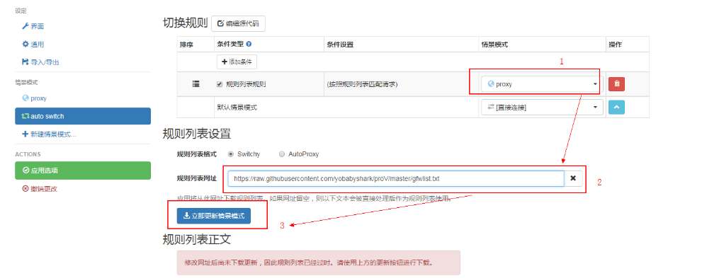然后,在规则列表规则中,情景模式改为proxy,规则列表网站复制下面的网址,然后点击立即更新情景模式,保存即可。